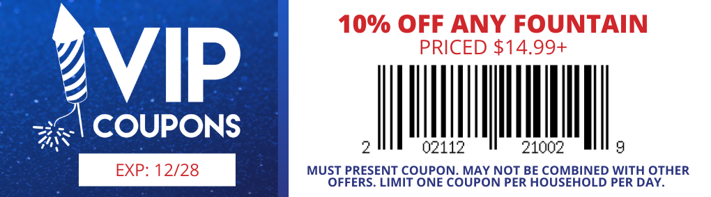 Start stocking up on fireworks for your New Years celebration! Purchase any fountain priced $14.99 or more and get 10% off with this coupon!